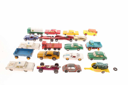 This lot of 20 vintage toy diecast vehicles includes original Hot Wheels Redlines, Matchbox, and Aurora cars/trucks along with a motorcycle in varying played with condition.