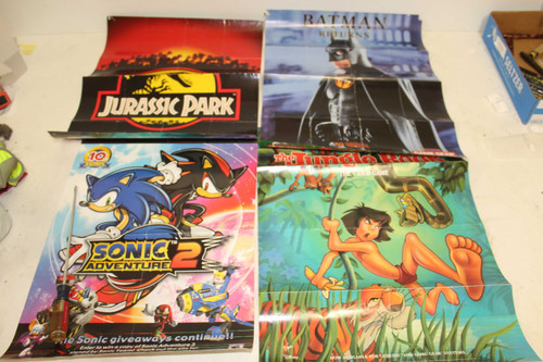 This lot of four vintage Sega Genesis or Sega Game Gear game posters includes Sonic 2. Jurassic Park, Batman Returns and Jungle Book. They date from the 1992 to 2001 and show some wear.