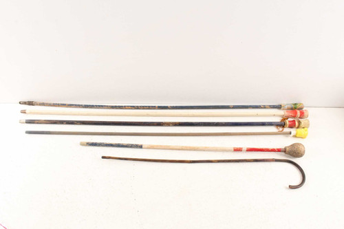 Description This assortment of six vintage wood carnival canes includes one with a dogs head that has top damage.