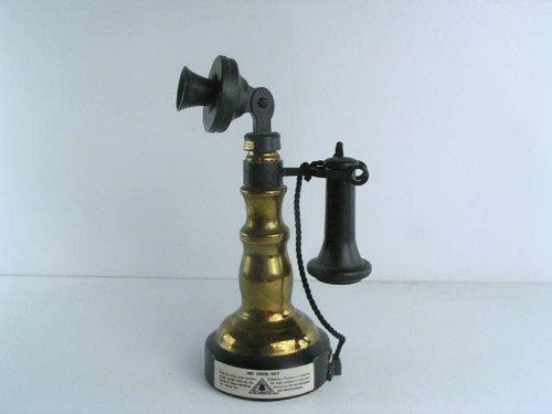 A neat vintage 1897 desk set brass telephone Jim Beam decanter bottle saluting the Telephone Pioneers of America that stands 14" tall and needs the cord end taped back on.