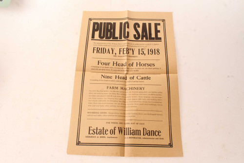 This original antique 1918 Nebraska public sale bill for the estate auction of William Dance was held on the FC Mather farm near Lincoln. It offered for sale horses, cattle, farm machinery and household. The auction bill is in amazing condition having been found folded up inside a book and it measures about 18" x 12" in size.