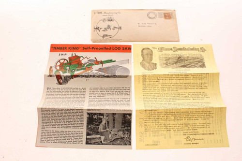 This vintage 1940's Ottawa mill equipment brochure features the Timber King self propelled log saw, Buzzmaster buzz saw, tractor saw and post hole digger. It also comes with the general manager letter and mailing envelope.