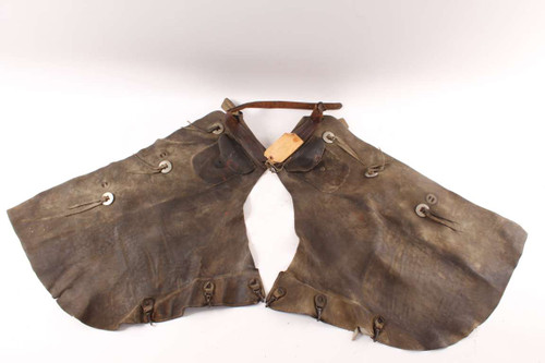 This set of antique western cowboy chaps come with a paper tag stating they belonged to Dale Erlewine. He was born around 1900 living in Perkins County Nebraska where these were acquired out of an estate. The chaps show plenty of real cowboy use with the conchos having been moved and one of the pocket snaps gone. They measure about 30" in length and would decorate nice in a western theme collection.
