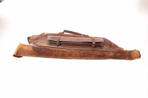 This early 1900's antique shotgun take down tooled leather case has a note inside stating that it was owned by Will Walker who died in 1936. It has wear with the end loose and it measures about 30" long.