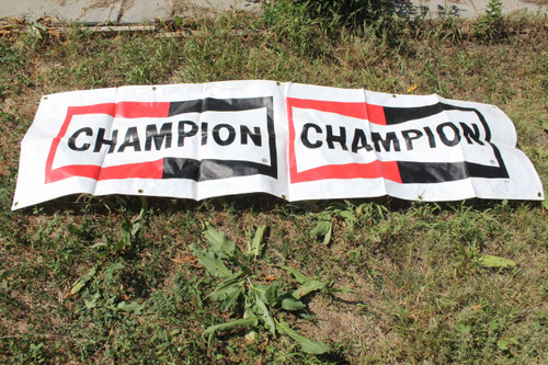 This vintage Champion spark plugs advertising banner measures about 90" x 26" in size.