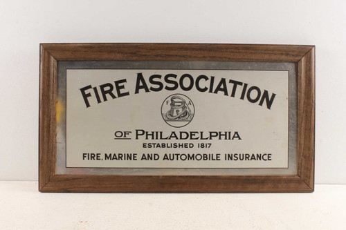 This antique Fire Association of Philadelphia Fire, Marine & Automobile Insurance since 1817 metal advertising sign has been put in a modern oak frame and it measures 27" x 14 1/2" in size.