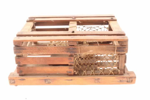 This primitive antique wood fish crab trap with old netting may be a salesman sample based on its size which is 10" x 6 5/8" x 4".
