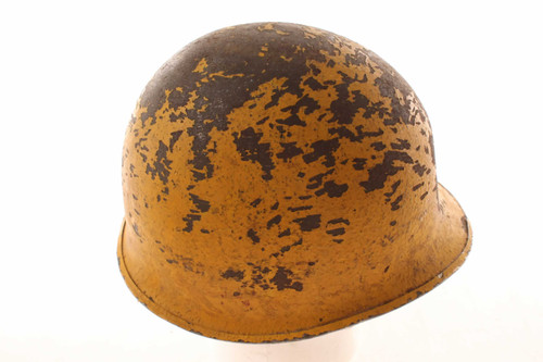 This vintage World War 2 US Army helmet has an unusual yellow color paint finish with Germany 4-8-45 marked on it and what appears to be a bullet/shrapnel dent in it. The helmet comes with a chin strap and there is a piece of rolled edge gone. This came out of a closed down bar in Nebraska where it had been on display for decades.