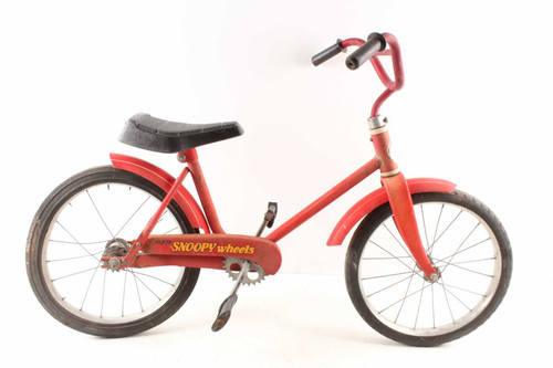 This vintage Huffy Snoopy Wheels kids bicycle is dated 1958 and measures about 43" long. There are conditions issues with the tires and pedals along with wear but it would still display well in a collection.
