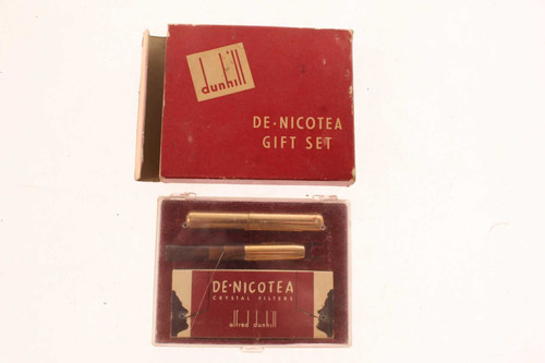 This vintage Alfred Dunhill De Nicotea gift set with the original box comes with a cigarette holder, matching brass carrying case for pocket or purse and replacement filters.