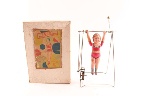 This vintage Lola The Lady Marvel wind up toy features a celluloid lady who spins around a bar. She is working with the original worn box and the toy stands about 8" in height.