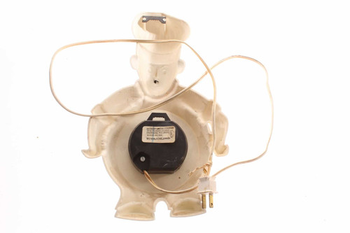 This working vintage Mid Century Ingraham chef plastic wall clock has some discoloration to the dial and measures 12" tall.