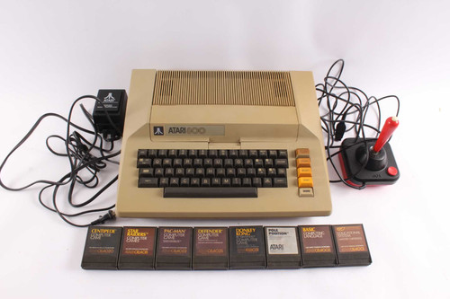 This vintage Atari 800 computer gaming console comes with eight cartridges and a joystick. It comes with a power supply, joystick and the following cartridges: Computing Language, Educational System, Donkey Kong, Pac-Man, Pole Position, Star Raiders, Defender and Centipede. We powered it up and tested all of the cartridges which are working. The case is in nice condition with no damage.